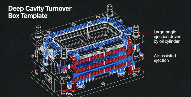 ความท้าทาย: ขนาดของตู้คอนเทนเนอร์ต้องเป็นไปตามมาตรฐานโลจิสติกส์สากลอย่างเคร่งครัด (เช่น มาตรฐานยูโร, JIS) และบูรณาการเข้ากับระบบจัดเก็บข้อมูลอัตโนมัติและมือจับหุ่นยนต์ได้อย่างราบรื่นวิธีแก้ไข: ขนาดแม่พิมพ์ที่สำคัญ (เช่น ขอบด้านนอก การระบุตำแหน่งร่อง แถบเรียงซ้อน) ผ่านการตัดเฉือน CNC ด้วยความแม่นยำด้วยการตรวจสอบ CMM เต็มรูปแบบ ทำให้มั่นใจได้ว่าการเบี่ยงเบนระหว่างแบทช์ต่อแบทช์เป็นศูนย์ แผ่นดีดออกอัตโนมัติและตัวกั้นสายพานลำเลียงในตัวช่วยให้ “การลำเลียงแบบอัตโนมัติในการกำจัดแม่พิมพ์” เป็นการวางรากฐานสำหรับการผลิตในโรงงานมืดแบบไร้คนควบคุม